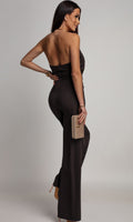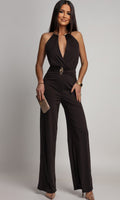 Jij gaat sowieso stralen met deze geweldige jumpsuit bruin pip. Ze sluit prachtig aan op het lichaam. De pijpen van de jumpsuit zijn wijd lopend, waardoor je een mooi elegant hakje kan dragen. Deze jumpsuit is voorzien van een leuke, sierlijke, goudkleurige band in de nek. Daarnaast heeft de riem ook een goudkleurige gesp(gesp kun je er eventueel afhalen). Deze jumpsuit kan voor elke gelegenheid gedragen worden.